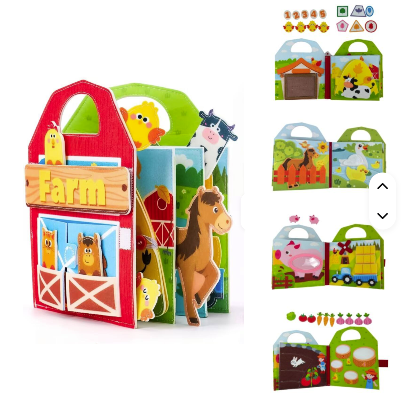 Carte senzoriala de tip Busy book, cu manere, din fetru de calitate, Montessori, tematica ferma, numeroase activitati, 9 pagini educative si interactive, ideala pentru copii de 1-5 ani, 24x21x10 cm
