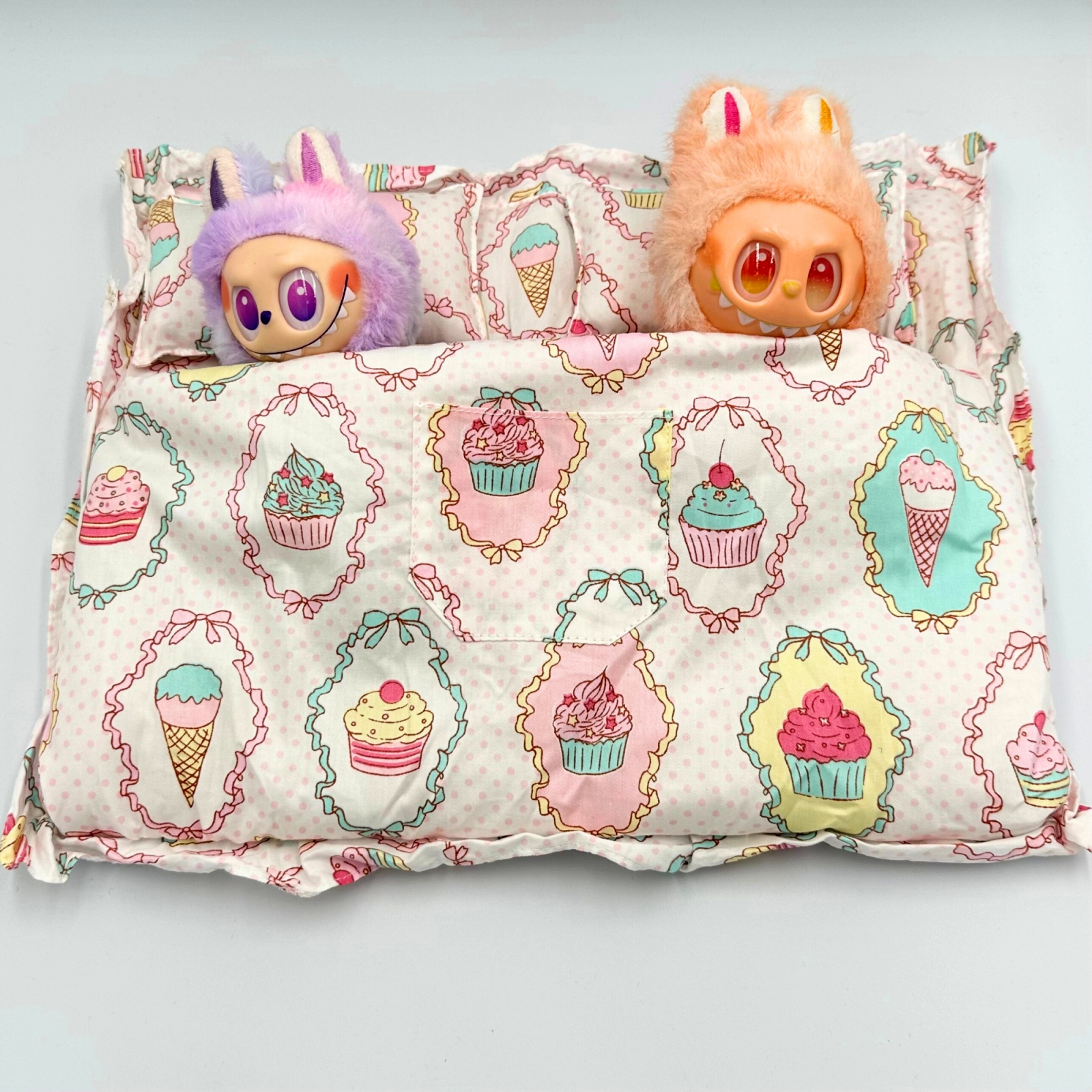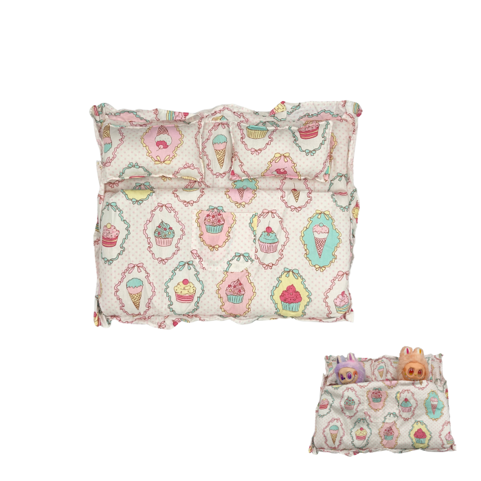 Lenjerie de pat pentru papusi, compatibil si cu Labubu, modelul de 17 cm, bumbac, material de calitate, doua perne si set lenjerie si pilota, 40 x 32 cm.