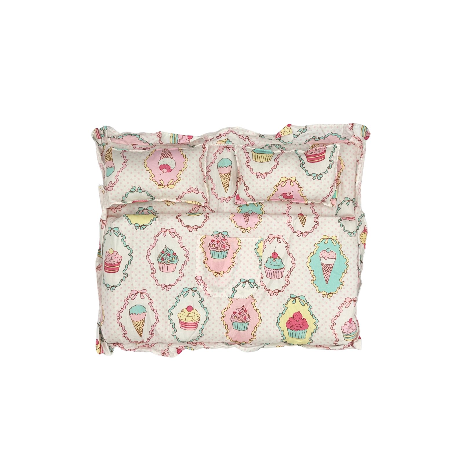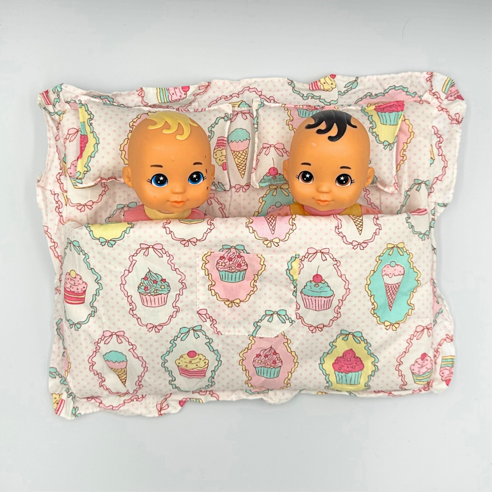 Setul contine: doua perne de 7 x 13 cm si un asternut cu lateralele cusute, in care incap papusi, plusuri sau bebelusi de maxim 26 cm lungime.
