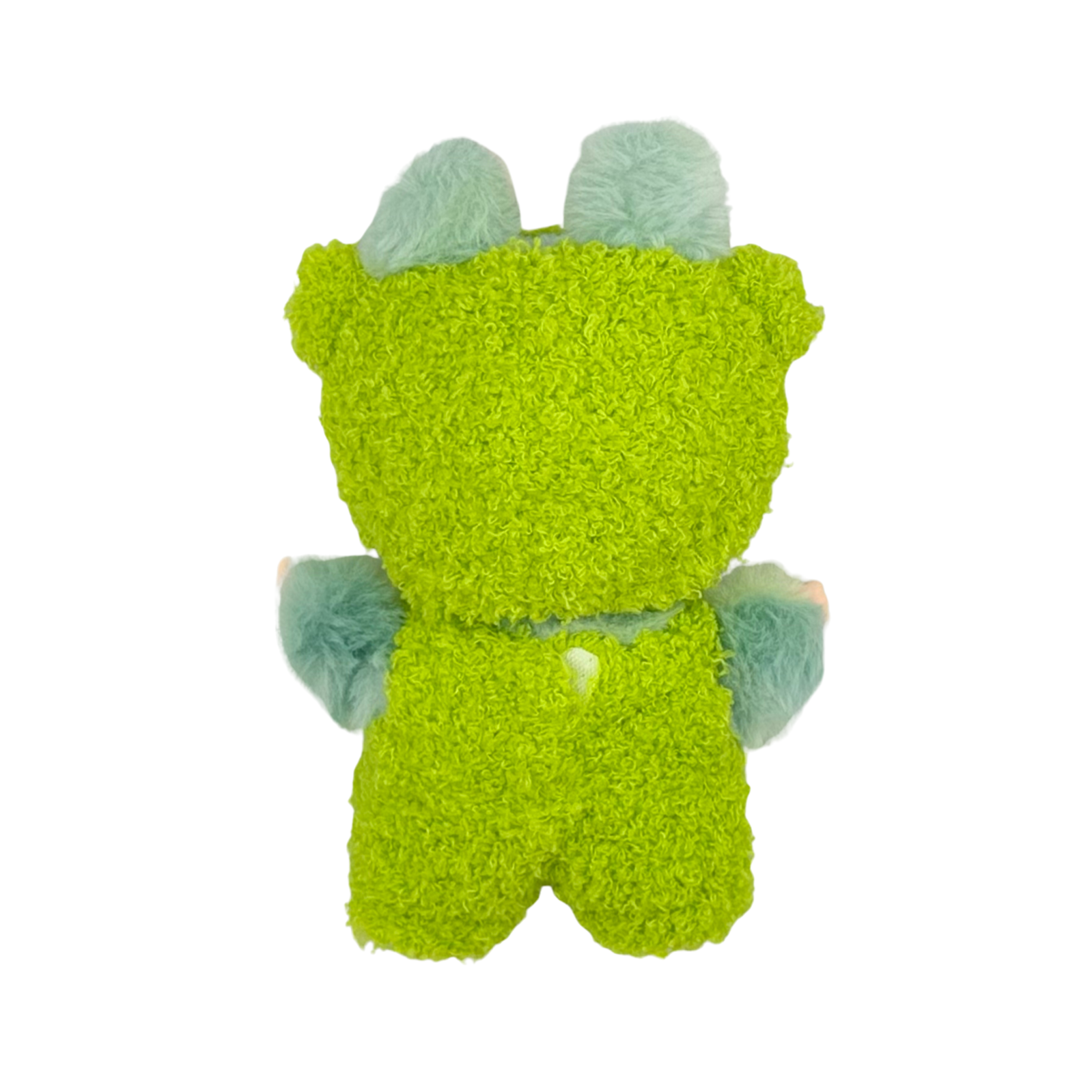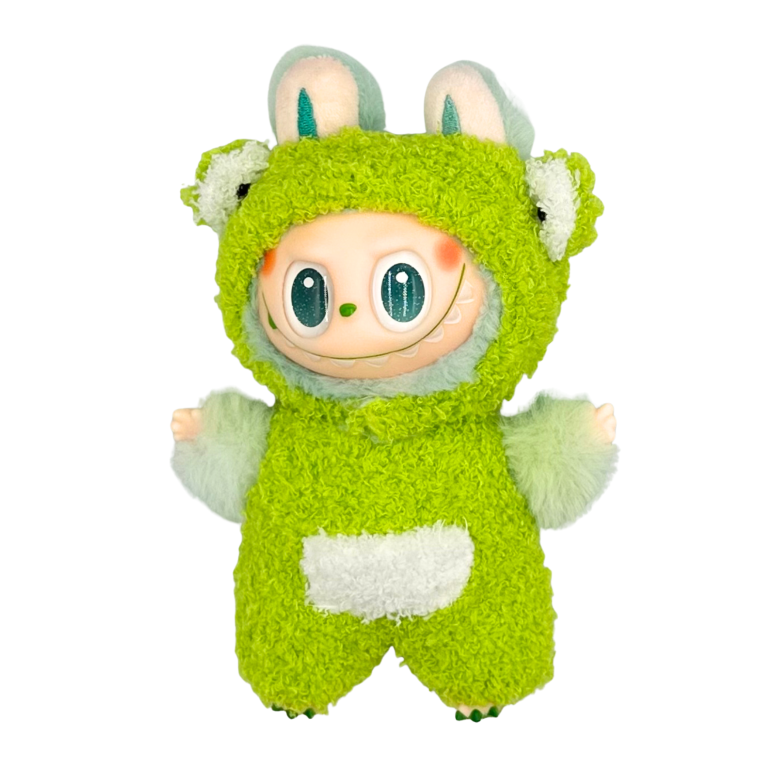 Set îmbrăcăminte pentru păpuși sau pentru Labubu de 17 cm, model broscuță, alcătuit din salopetă și căciula asortată.