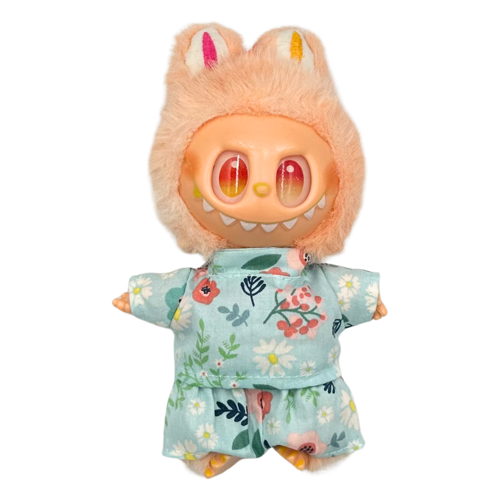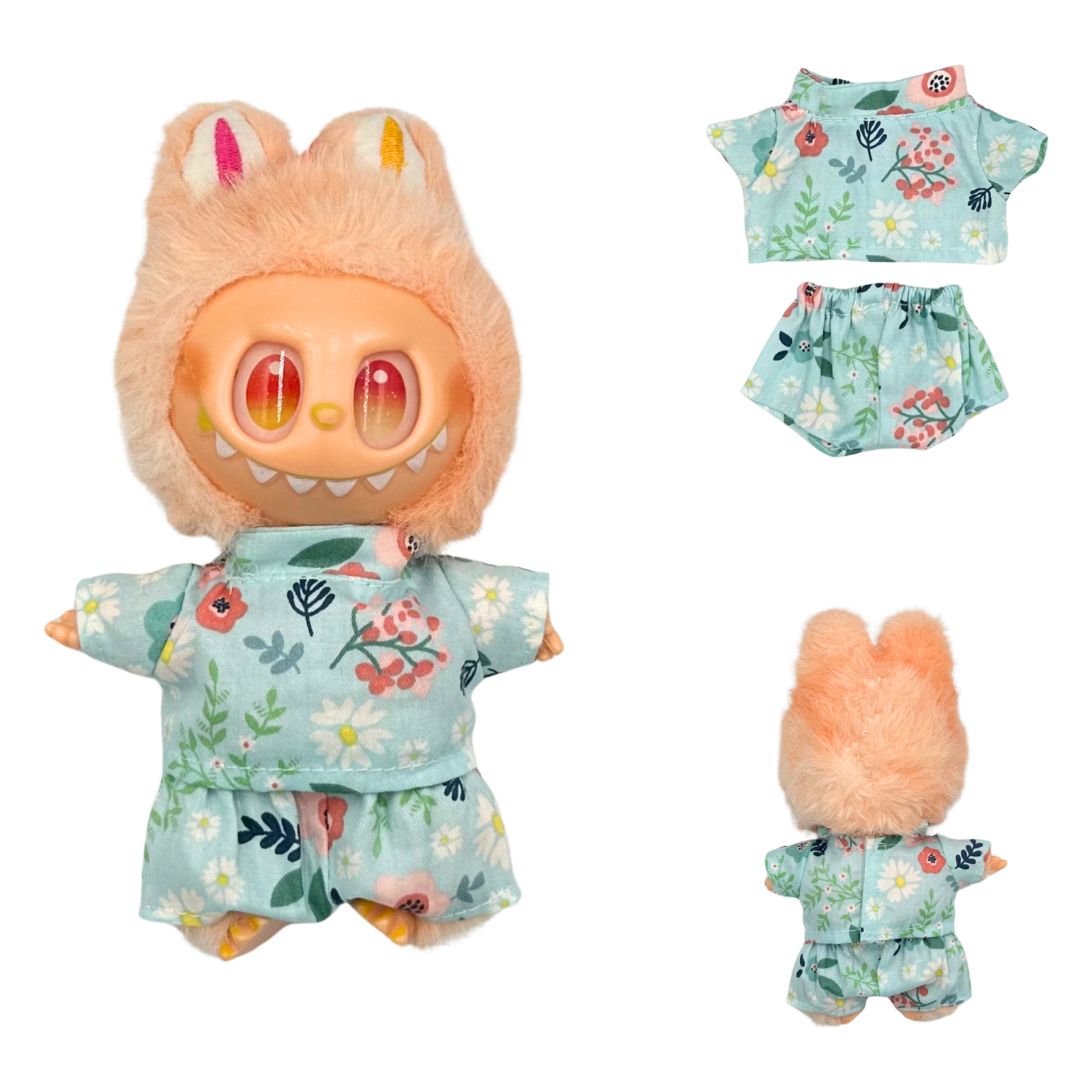 Haine pentru Labubu: Set imbracaminte pentru papusi, compatibile cu Labubu de 17 cm, casual, model bleu cu flori, alcatuit din bluza si pantaloni